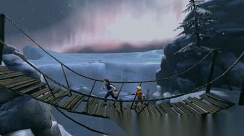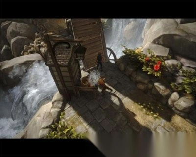 3)走进村子后转动镜头,爬上三个形似鼓的物体并通过,接着爬上左边的绳梯,从别人家的顶梁滑落到后院。此时,那个挡桥的人会再次出现挡住大门。随后操控弟弟,从旁边的铁栅栏钻过去,转动把手放出狗,接着从石门通过,沿着小路来到一座桥前。大桥看守正在睡觉,先让弟弟与他互动,再操控哥哥,之后大桥看守就会放下桥,兄弟二人便可通过。