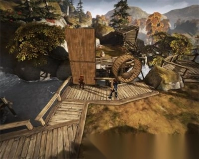 4)兄弟俩一路往下行进,一同推开一扇门后,来到一处貌似存放粮食的场所(途中有几口井,要是弟弟与井互动,就会往井里吐痰 = =)。有条狗对着兄弟俩狂吠不止,此时兄弟俩需交替互动。先是弟弟吸引狗的注意力,哥哥趁机跑到“鼓”上,接着哥哥吸引狗的注意力,好让弟弟能够通行,如此反复才能通过此地。随后继续前行,穿过障碍后来到一座农舍前,此时要经过一座小桥。先让弟弟在桥旁的开关处不停地跑步,哥哥则到对岸抱回一只羊,然后把羊扔到开关上,让羊代替弟弟跑,这样兄弟俩就能通过了。