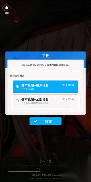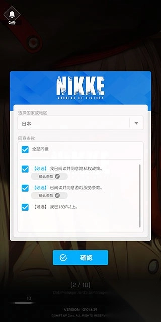 1. 下载并安装《NIKKE胜利女神》后,第一步要选择国家地区(服务器选择在后续步骤),勾选所有同意选项,然后点击下方的确认按钮。