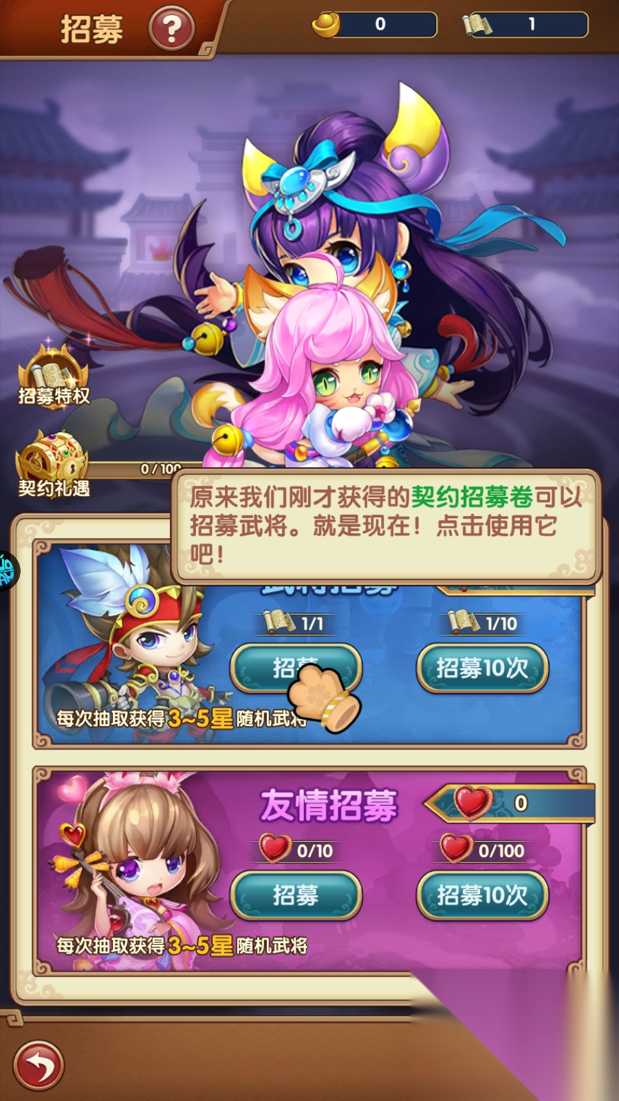 2、点击招募,去招募自己的第一个武将。