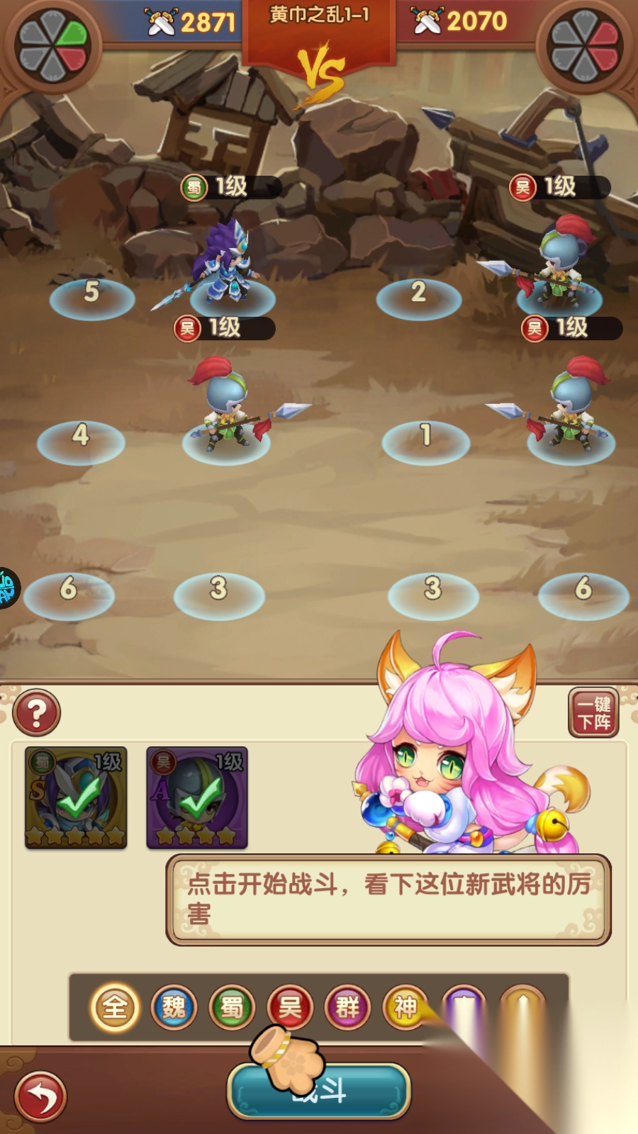4、闯关前需要把武将排兵布阵。