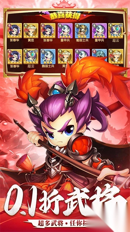 这款游戏采用放置的玩法,玩家只需要将武将上阵即可,无需时刻操作,让玩家在休闲摸鱼的适合可以打发时间,另外,这个版本还未大家带来了超多福利,全场0。1折开局就送十连抽,让玩家轻松提升战斗力,还等什么,快来下载吧。