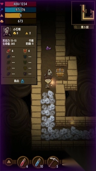 5、到了第5层,出现了一个强力的怪物,血量高达385,以我们现在的攻击,是要砍很多下的,所以我们也会受到更多的伤害,不值得我们去打,小石怪在第五层我们能不打就不要去打,以我们目前的实力打他很吃亏。其他怪全清,宝箱骸骨堆能开就开,有小石怪就不打(拦路的话就打)