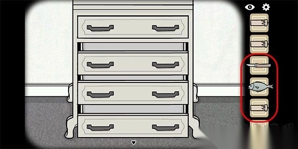 3、拉开抽屉,从第二格取出小刀,在第三格拿起鱼,于第四格寻得第三支蜡烛,至此完成道具收集。