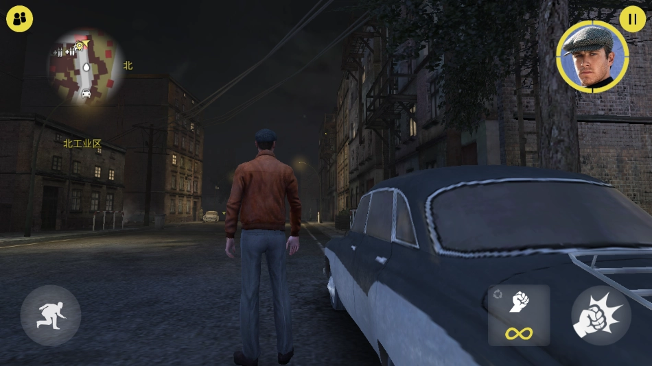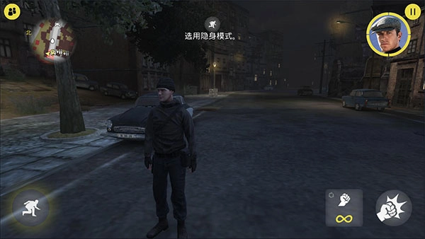 4、点击左下角的蹲伏图标按钮可以选用潜行隐身模式,左上角是游戏地图,右上角是暂停菜单以及人物状态,右下角是武器切换和攻击按钮。