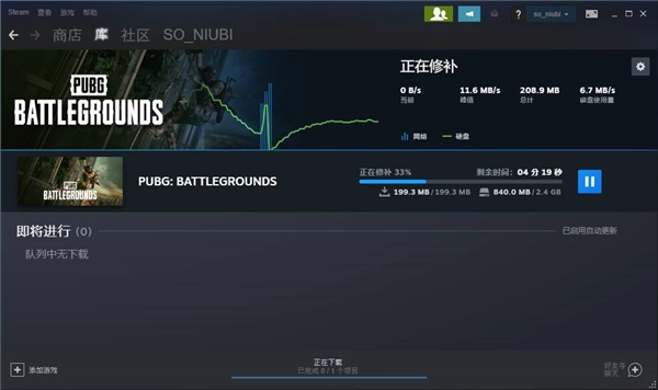 1. 一般来说,Steam游戏大多会开启自动更新功能。如此一来,一旦游戏有更新需求,玩家登录Steam后,更新便会自动启动。如下图呈现的便是Steam平台上《绝地求生》的更新画面。