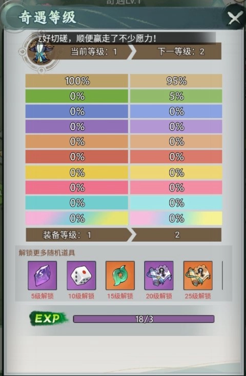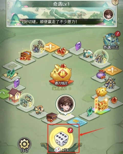 6、当走到“升级”格子时,若奇遇经验达到升级条件,便会自动升级;若经验不够,则随机获取部分奖励。