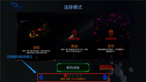 3、战役模式设有多种任务线程供你挑选,在直面大 Boss 前,需稳步谨慎推进,同时不忘升级修炼。倘若你热衷于高风险高回报的挑战,那么选择困难模式,就能获取更为丰厚的积分。此外,你还能在无限模式中冲击高分,让全宇宙都为你惊叹!
