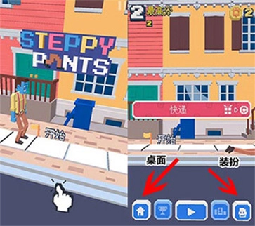 4、当我们进入长腿漫步后,便会即刻开启一轮游戏。此时,我们既能够直接结束游戏,也可以先进行一波挑战,直至本局游戏结束。随后,菜单栏就会出现,最左边的是游戏桌面,右边则是装扮选项。