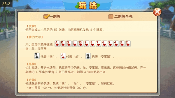 张数方面,总计为1副牌,把大王和小王去除后,供4个人进行游戏,每人会分得13张牌。