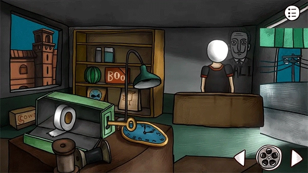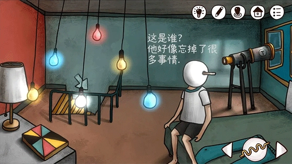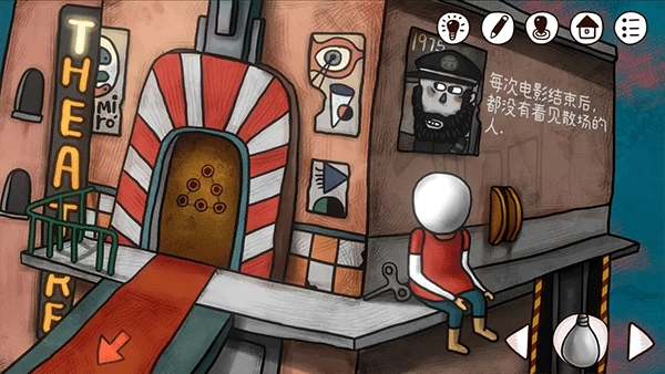 走上楼,将发条安放在男孩的头部,点击该发条,从而获取电影院大门的密码(密码即为灯泡的颜色)