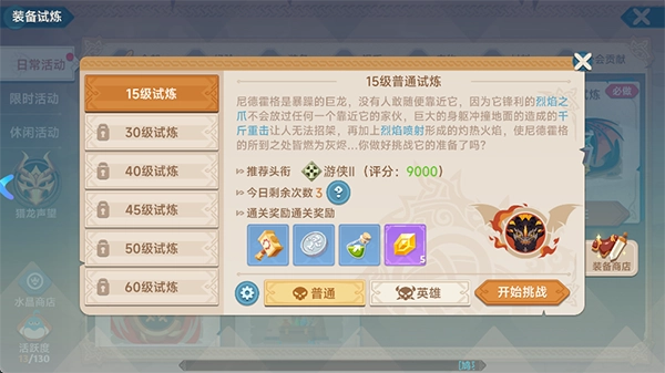 游戏关卡分为普通难度与英雄难度,每天可挑战5次。在此建议优先选择英雄难度,因为该难度下高品质装备的掉落概率更高。从40级试炼起,挑战关卡会掉落磨牙之龙道具,此道具可用于兑换传说级装备。
