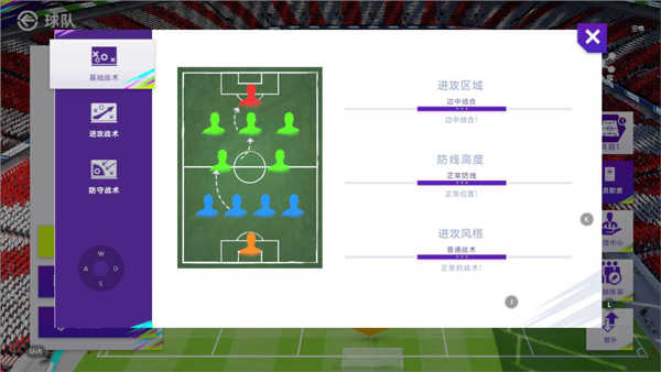 防守方面,压迫强度上维持前场逼抢,尽可能迫使对手快速出球,从而造成其失误,以便展开前场快速反击。在防守策略上,选择让边锋回撤进行重点盯防,做到协防与盯人兼顾。同时,保持适当的防守间隔,这样也能维持球员间的配合。后防线采取较为自由的策略,原因在于追求稳定,造越位战术容易导致后防被对手打穿。