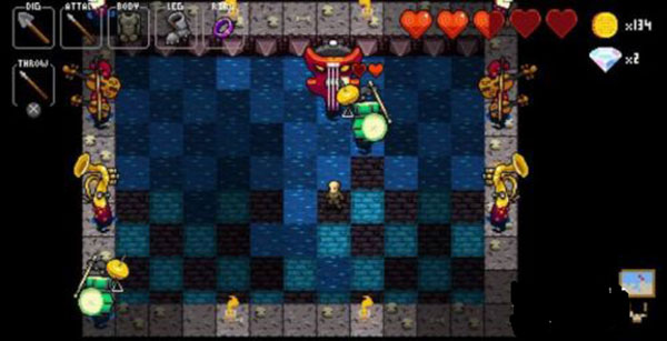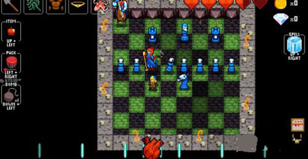 在每个关卡里,我们都能拿到至少一件武器来防身,地板上每次只能移动一格,碰到敌人时可以朝敌人方向移动并对其造成伤害。要是音乐停了,就意味着要进入下一层地牢了。