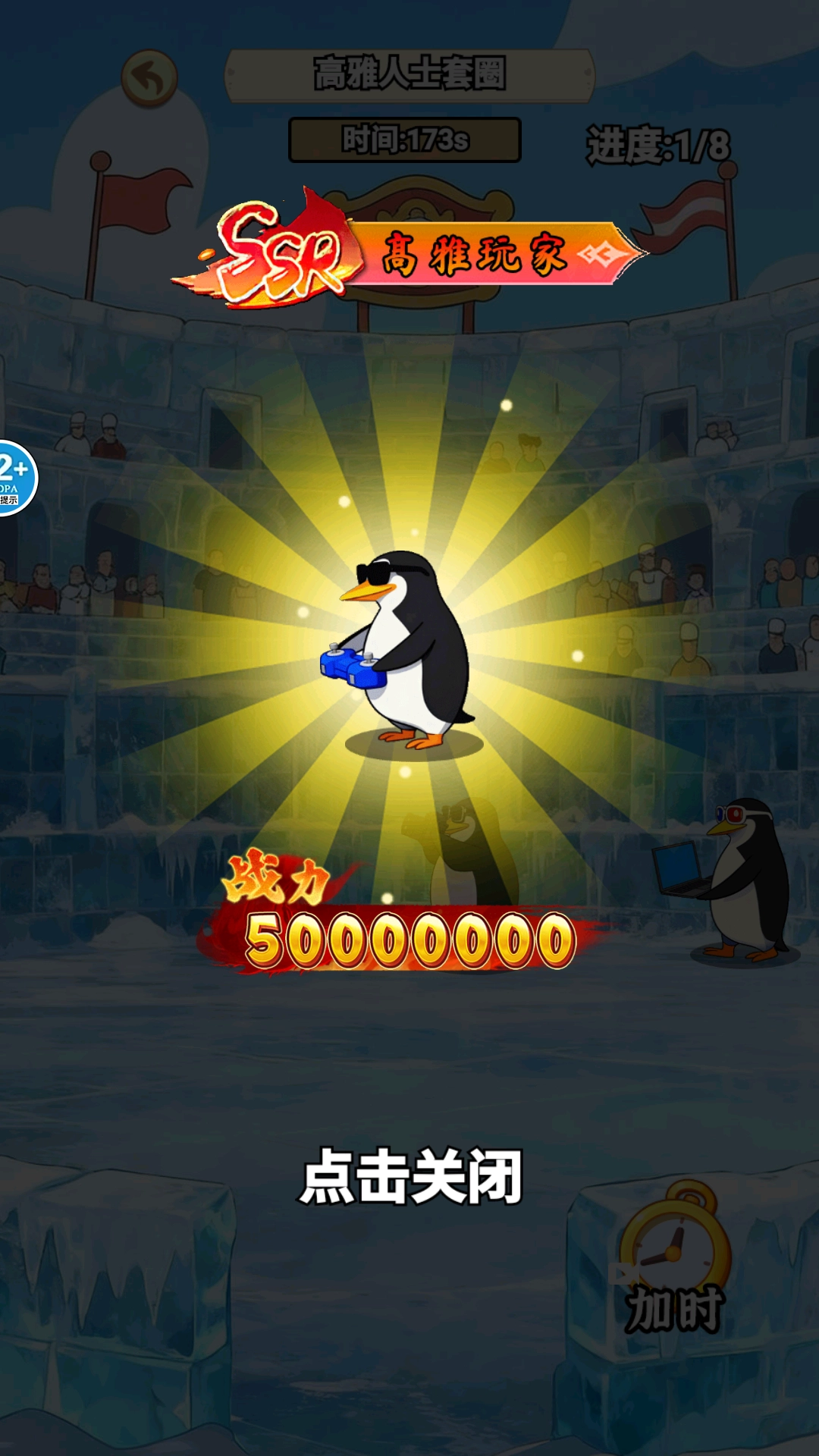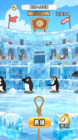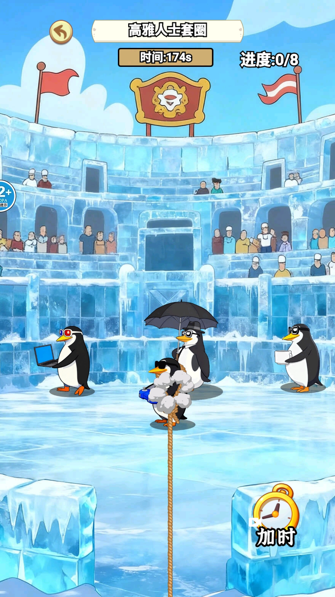 如图所示,在“高雅人士套圈”这一关卡里,玩家要把握好时机点击操作,只要在6分钟内顺利套中8只企鹅,就能完成这一关的挑战。