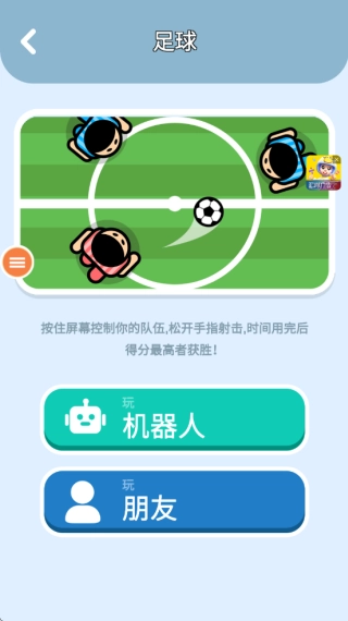 2. 就像下面这张图展示的那样,我选了足球这个选项,点进去之后,既可以选择跟机器人对战,也能选择和朋友一起玩。