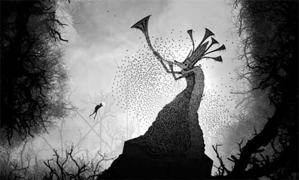 这款诞生于21世纪20年代的游戏,既未采用互动性更强的三维场景,也没有运用高档开发引擎打造逼真的3D画面,而是选择了简约朴素的二维场景与类似铅笔画的手工质感画面;画面的色调更是简洁到极致,仅通过黑与白不同浓度的调配,构成了游戏画面的所有色彩。