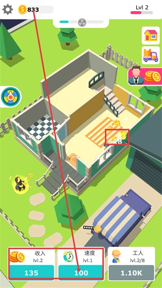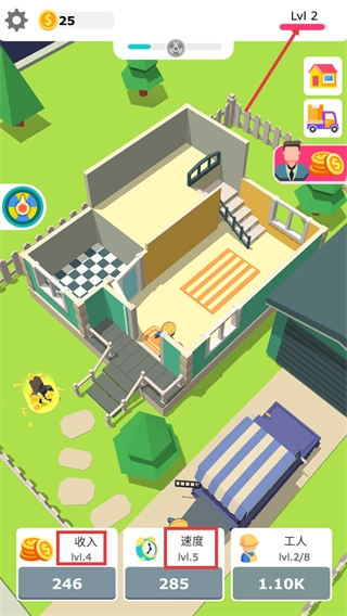 2、打造阶梯式成长体系,玩家可通过增加工人数量、提升施工效率、升级货车容量等方式,全方位加速装修进程与收益增长。