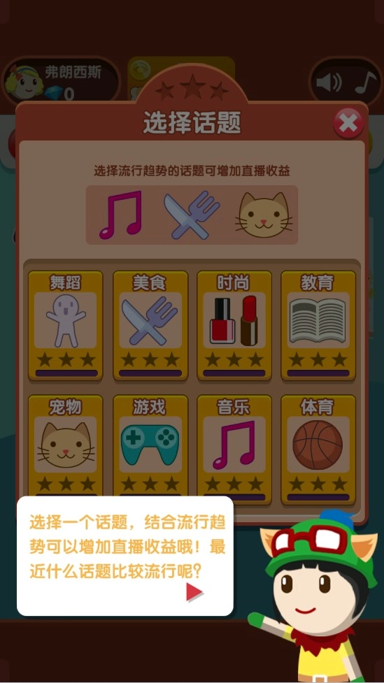 选择热门话题进行直播,获取更多金钱和粉丝。