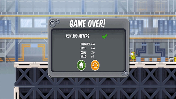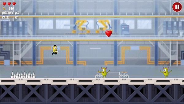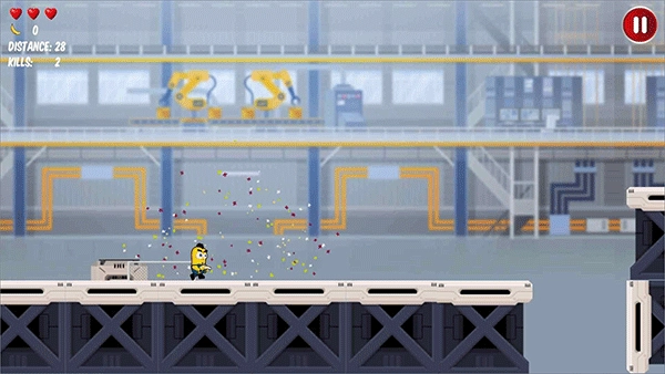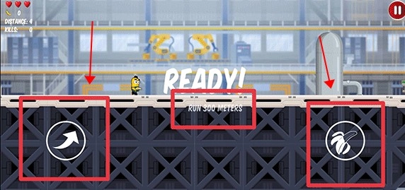 进入游戏后,屏幕会呈现当前关卡的目标。右侧的按钮负责操控小黄人跳跃,左侧的按钮则用来进行射击操作。