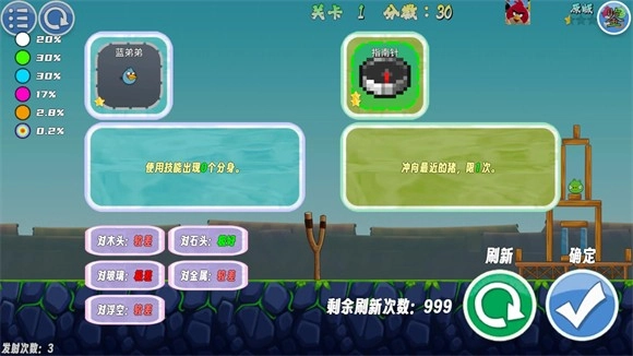 确定关卡后,即可挑选对应的小鸟开启挑战。不同等级的小鸟与道具的效果、特性都会在界面上清晰呈现,点击刷新按钮还能获取全新的小鸟和道具组合。