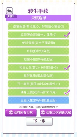 在完成上一步操作后,接下来需要为角色设定基础特质。对这些特质进行恰当的规划至关重要,例如若某一关键特质数值偏低,可能会在后续的人生旅程中增加遭遇健康危机的风险。