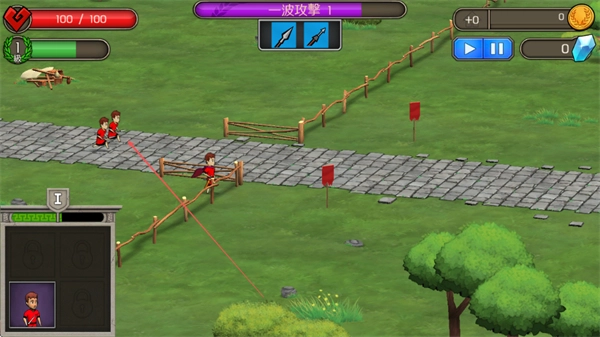 在第一波攻势里,点击左边的防御单位红衣战士,把它安置在石板路的关键地点,以此阻拦敌方的进攻。