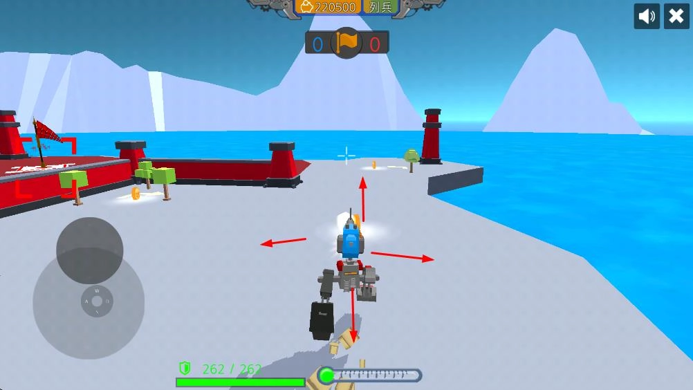 在游戏场景里,玩家可以操控机器人角色随意移动,收集金币之类的资源,界面上还会显示护盾值与生命值。