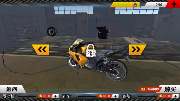 1、在车库里,玩家能够用挑战关卡得到的金币购买车辆,还可以对摩托车的发动机、刹车、轮胎这类部件开展强化升级。