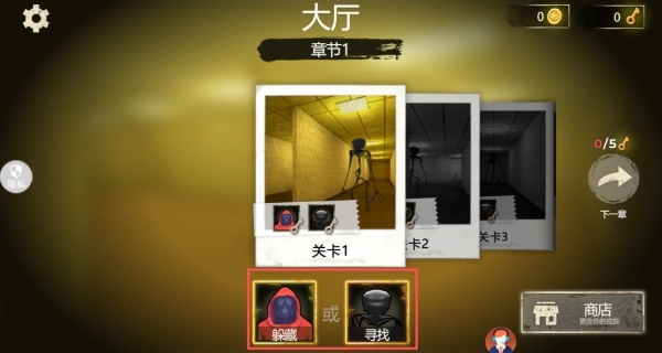 1、进入游戏大厅后,从章节1开启游戏,首先要选择躲藏者或寻找者这两种身份中的一种。