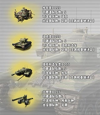 挑战火炮BOSS时,你可以派出全部兵力;而挑战其他三个兵种的BOSS时,你则可以派出日常五队的兵力。