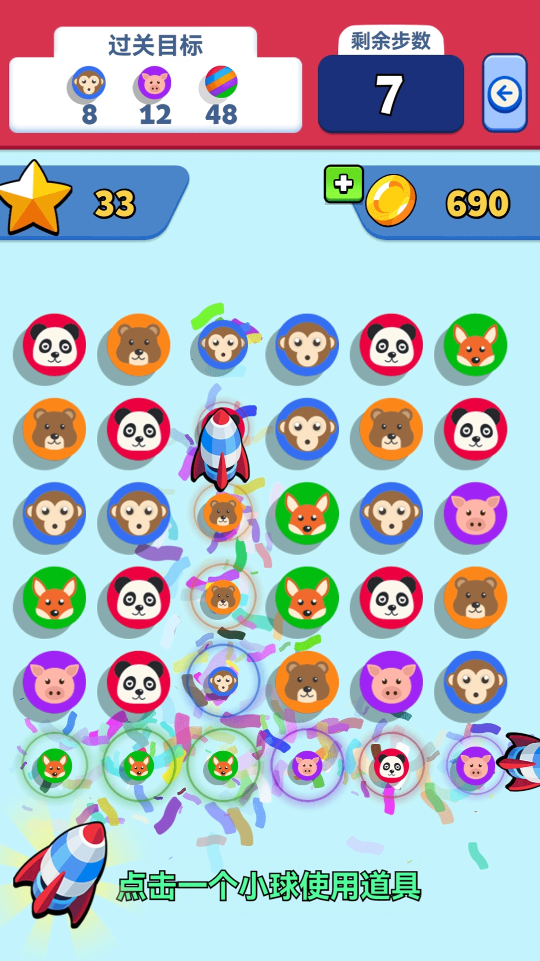 1.玩家用手指滑动来连接相邻且相同的动物徽章,只要连线长度不少于三个就能将其消除。
