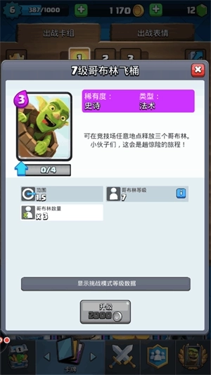哥布林飞桶:3圣水解锁,可任意地点投放,主要用于快速拆塔,速度快、伤害高
