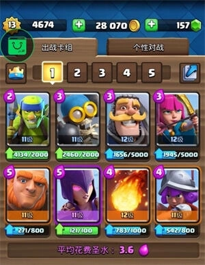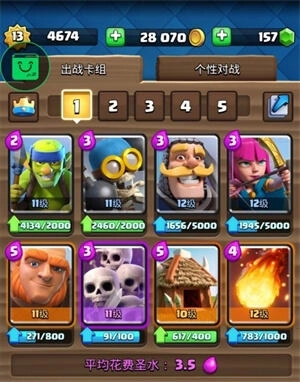 推荐组合:骷髅军团+哥布林飞桶+飞龙宝宝+野蛮人滚桶+哥布林小屋+火球+骷髅墓碑+猎人,平均圣水消耗3.5