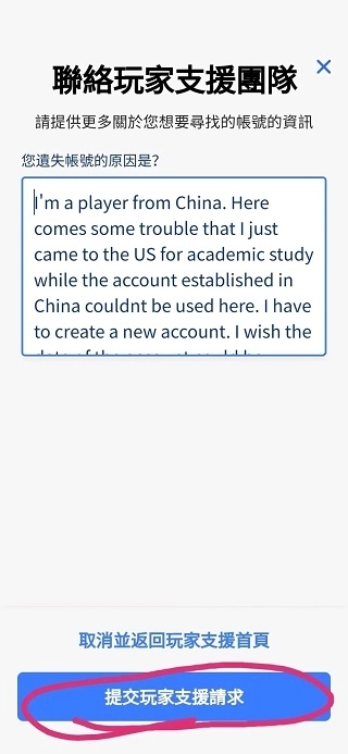 进入该页面后,在输入框中说明你的账号问题,并点击提交按钮。