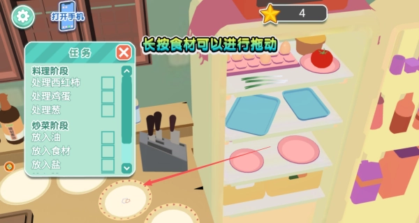 2、点击冰箱图标开启储物空间,长按需要的食材并拖动到料理台,准备对其进行处理。