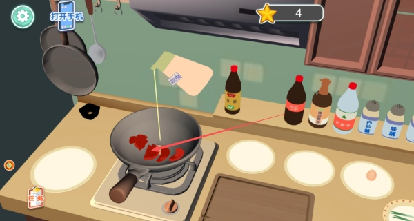 4、用灶台烹炒菜品时,要适时取用右侧调料架上的调味品,通过精准的用量配比来提高菜品的评分